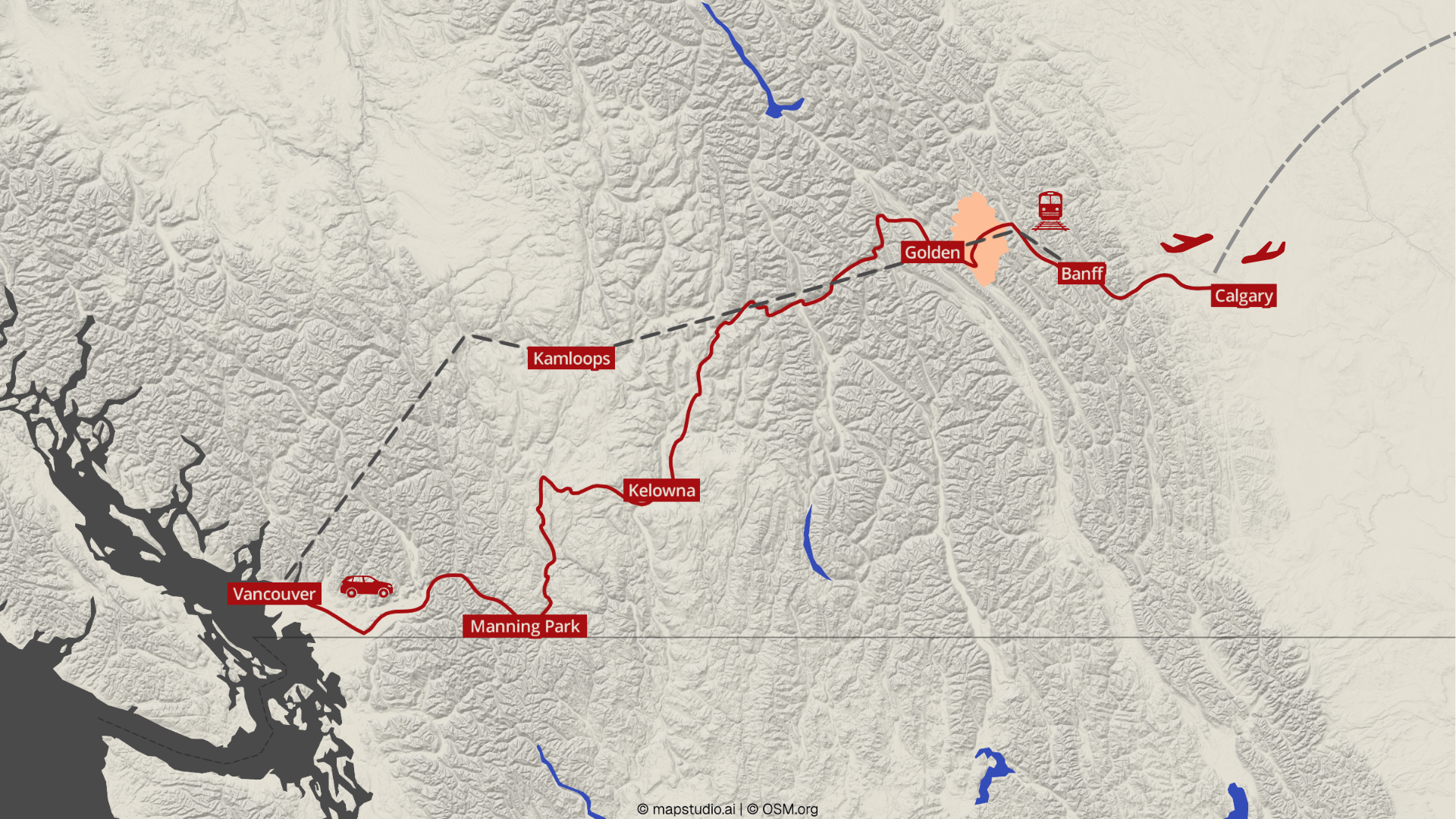 Heute verabschieden Sie sich vom sonnigenΒ Okanagan ValleyΒ und setzen Ihre Reise in RichtungΒ Golden fort. Die Fahrt dauert etwa 4,5 bis 5 Stunden und fΓΌhrt Sie durch abwechslungsreiche Landschaften: von sanften HΓΌgeln ΓΌber eindrucksvolle BergpΓ€sse bis hinein in eine zunehmend alpine Kulisse nahe mehrerer Nationalparks. Unterwegs lohnt es sich, immer wieder anzuhalten, sei es an Aussichtspunkten oder in kleinen, charmanten Orten entlang der Strecke.