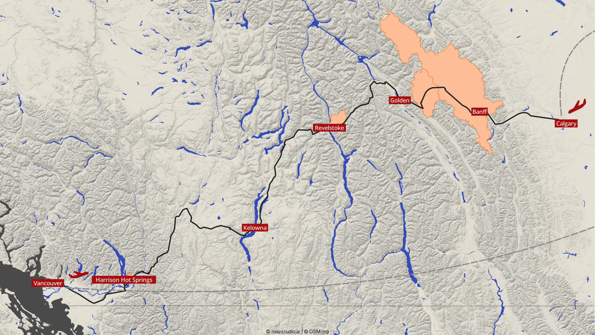 Am frühen Nachmittag heißt es dann: Auf nach Revelstoke! Die rund 2,5-stündige Fahrt führt durch abwechslungsreiche Landschaften und stimmt bereits auf neue Abenteuer ein.